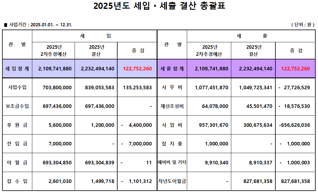 2025년 결산 및 후원금(품) 수입, 사용내역 공개